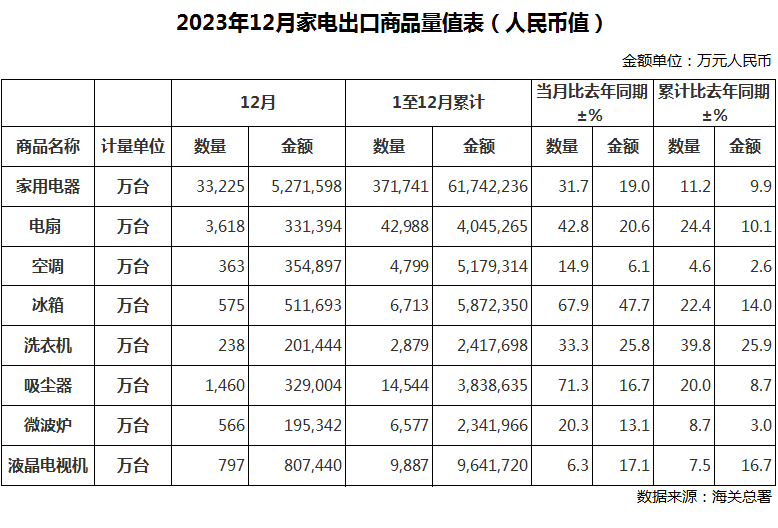 - 2023年12月中國家電出口量出爐,冰箱同比增長67.9%