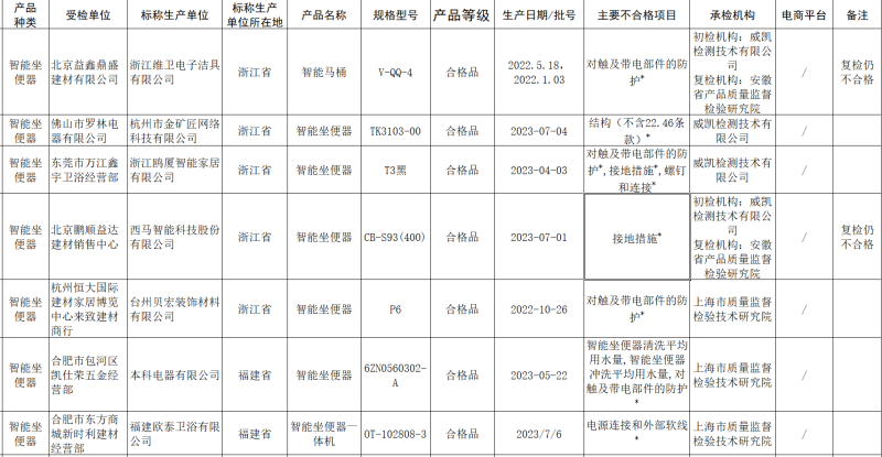 - 7批次智能坐便器抽查不合格,其中2批次復檢仍不合格