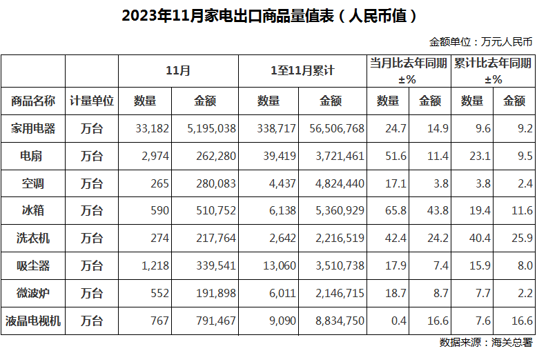 - 今年以來,我國家電外銷景氣度明顯上升。尤其是進入下半年,隨著海外家電市場需求逐步提振,庫存回落帶動家電出口回暖趨勢顯著。 海關總署數據顯示,2023年11月份,中國出口家用電器總量高達3