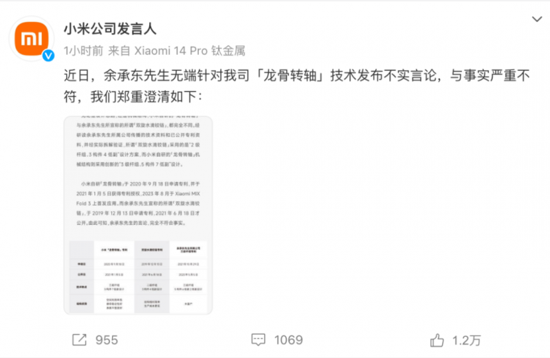 - 12月12日午間,小米公司發(fā)言人微博發(fā)文稱,近日,余承東先生無端針對我司龍骨轉(zhuǎn)軸技術(shù)發(fā)布不實言論,與事實嚴(yán)重不符。我們請余承東先生遵循“科學(xué)與嚴(yán)謹(jǐn)”的基本規(guī)則,請勿再抹黑同行