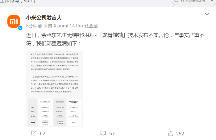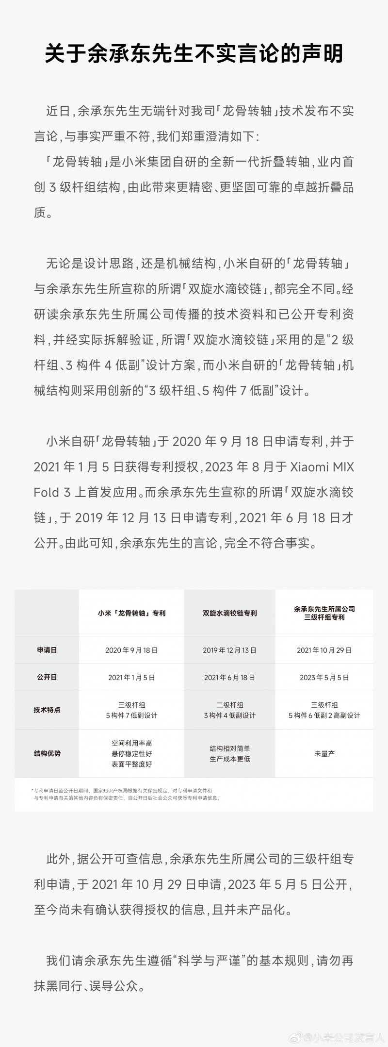 - 12月12日,小米公司發(fā)言人官方微博發(fā)文稱,近日,余承東先生無端針對我司“龍骨轉(zhuǎn)軸”技術(shù)發(fā)布不實言論,與事實嚴(yán)重不符。我們請余承東先生遵循“科學(xué)與嚴(yán)謹(jǐn)”的基本規(guī)則,