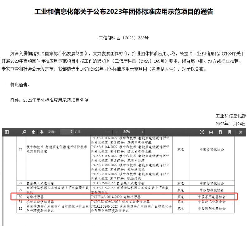 - 2023年11月24日,工業和信息化部公布2023年團體標準應用示范項目,中國家用電器協會標準《電動沖牙器》成功入選?! ”緲藴适菂f會在2020年主持制定并發布了全球首份具有廣泛代表性的電動