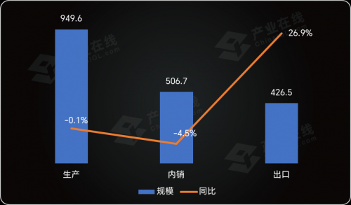 - 據產業在線最新發布的家用空調產銷報告顯示,2023年10月家用空調生產949.6萬臺,同比下降0.1%;銷售933.2萬臺,同比增長7.7%。其中內銷量506.7萬臺,同比下降4.5%;出口量426.5萬臺,同比增長26.9%