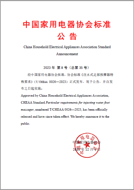 - 經中國家用電器協會批準,協會標準《注水式足部按摩器特殊要求》(T/CHEAA 0026—2023)正式發布,現予公告,并自發布之日起實施。中國家用電器協會標準公告2023年第8號《注水式足部按摩