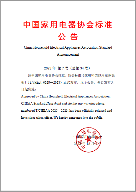 - 2023年12月4日,中國家用電器協會兩項團體標準正式發布,分別為T/CHEAA 0025—2023《家用和類似用途保溫板》和T/CHEAA 0026—2023《注水式足部按摩器特殊要求》。這兩項標準均自