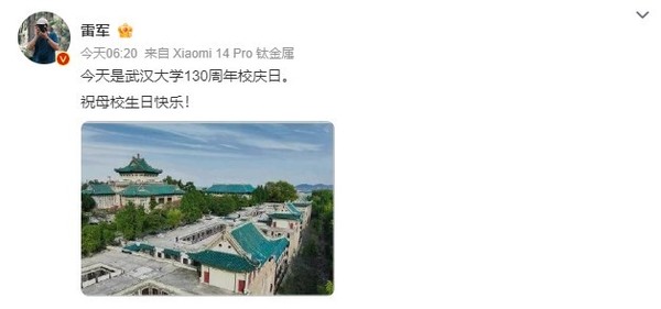 - 11月29日,武漢大學(xué)迎來了其130周年校慶日。在這個(gè)特殊的日子里,小米公司創(chuàng)始人、武大校友雷軍發(fā)微博祝賀母校生日快樂。他表示,今天是武漢大學(xué)的130周年校慶日,祝母校生日快樂。
