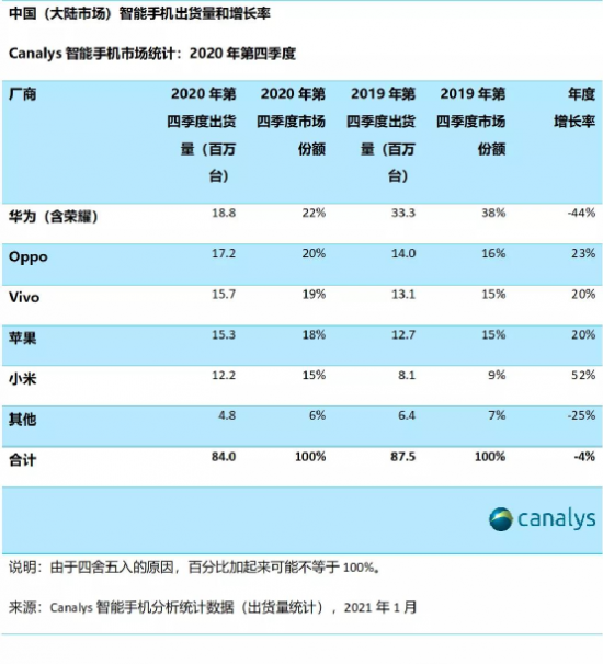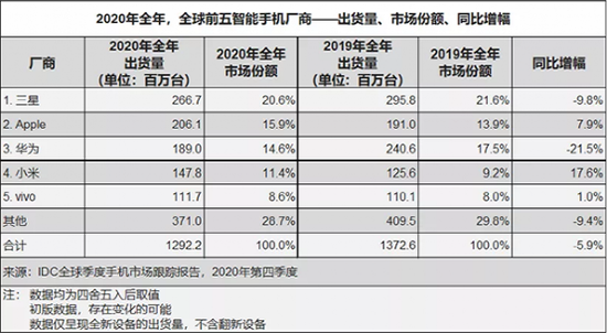 日前,IDC與Canalys都發(fā)布了報(bào)告數(shù)據(jù)。IDC報(bào)告顯示,2020年全年,出貨量前五大廠商分別是三星、蘋果、華為、小米和vivo,而OPPO已經(jīng)跌出了前五。三星以20.6%的市場(chǎng)份額位居第一,同比下滑9.8%;蘋果第二,市場(chǎng)份額為15.9%;華為第三,市場(chǎng)份額為14.6%,同比下滑21.5%;小米和vivo分列第四和第五。