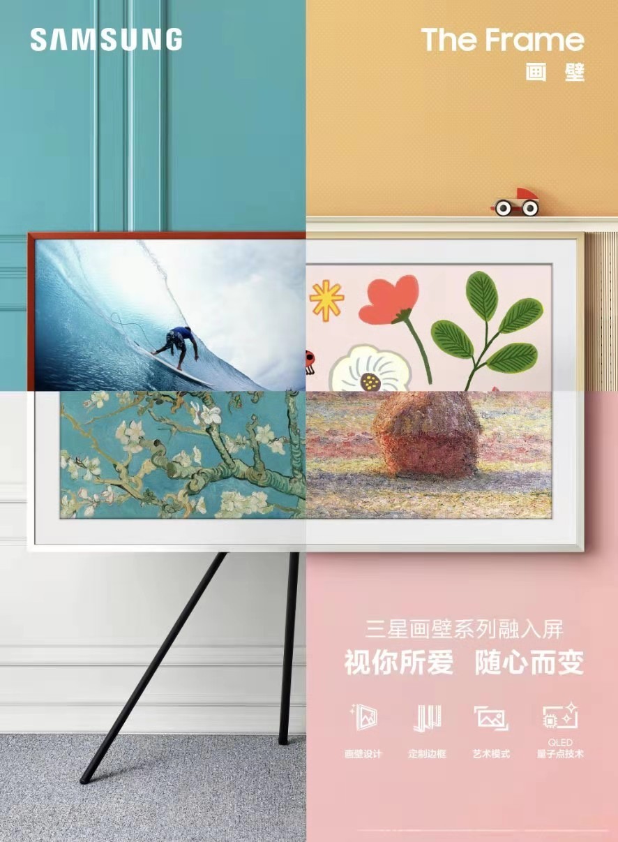 “畫家”The Frame在全球已擁有百萬用戶,其具備QLED飽滿畫質,同時兼容三星最新的回音壁音響。今年,三星對The Frame進行了全面升級,新款產品機身厚度僅為24.9mm,用戶可以選擇纖薄型貼合壁掛架、基礎桌面底座或者演播室支架。同時,三星提供5種不同顏色的邊框(選配)以滿足消費者的不同視覺需求。