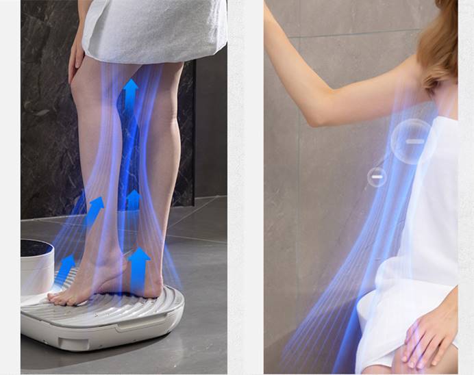 通過踏板上圓形的出風孔,向上噴出收集起來的凈化空氣,將汗液和水分更快速的分解蒸發,加速身體干燥的速度,同時將細菌有效祛除,又將濕氣隨空氣吹走蒸發,而且基本無接觸、防感染,無懼腋窩下,腳丫,還有敏感處的細菌感染問題,安全更高效。