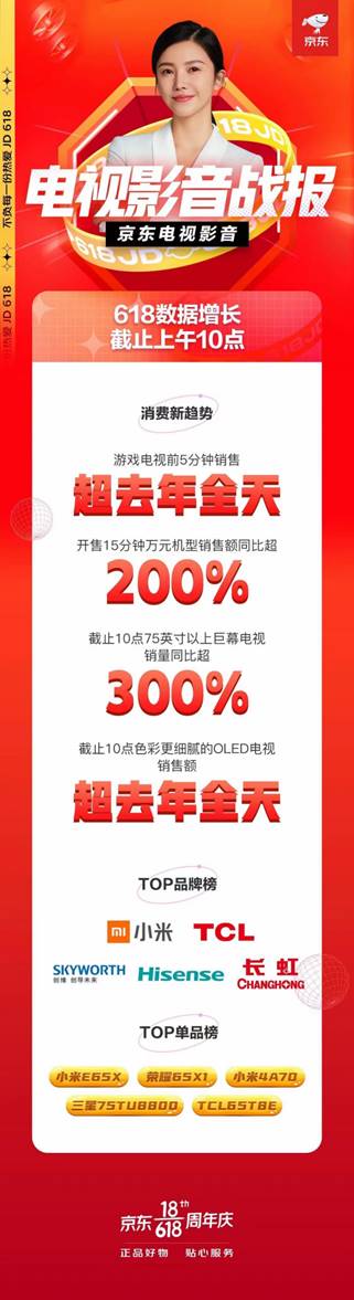 【劃重點】:截止6月18日10時,在京東平臺公布的電視影音戰報中,TCL智屏產品攬括了TOP品牌榜以及TOP單品榜,其中重磅新品TCL 65T8E量子點智屏更一躍進入今年618京東電視影音TOP單品榜,用實力贏得眾多用戶的青睞。
