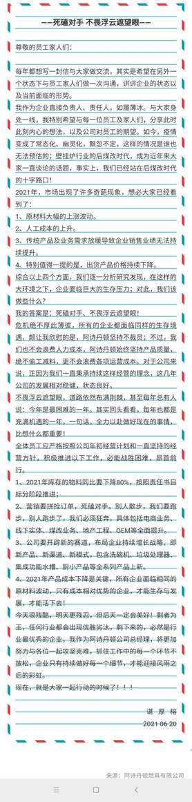 雖然早已做好準備,但是當面對所有來臨的事情,企業仍然會感到慌亂。阿詩丹頓燃具有限公司總經理諶厚榕給所有員工發了一封內部信來穩定軍心,向全體員工說下了自己的心聲。
