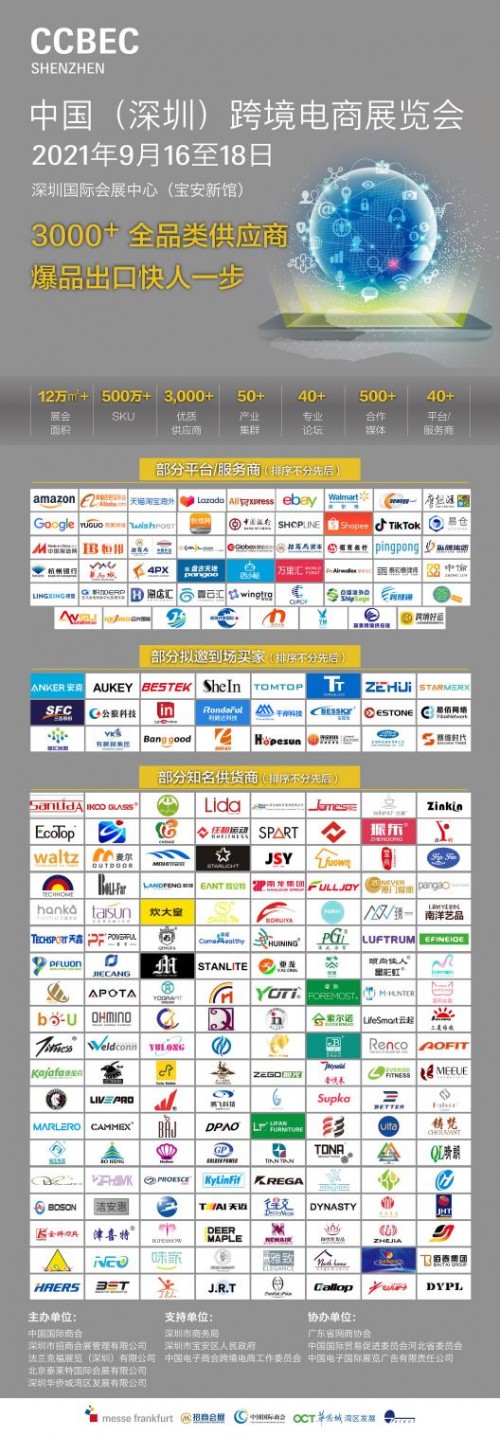 中國(深圳)跨境電商展覽會由中國國際商會、深圳市招商會展管理有限公司、法蘭克福展覽(深圳)有限公司、北京泰萊特國際會展有限公司和深圳華僑城灣區(qū)發(fā)展有限公司聯(lián)合主辦。
