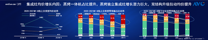 這時成熟大家電從“價格戰”轉為“價值戰”,集成灶領銜廚房電器整體增長,新周期來臨。在新周期之下,廚電全線走向場景化、高端化。通過奧維云網(AVC)線下監測數據我們可以看出,2021年1-8月,冰箱1W以上價格段產品零售額份額占比同比增長6.4%;集成灶13K元以上占比同比增長8.1%;油煙機7K元以上占比同比增長5.2%;燃熱5K元以上占比同比增長5.4%。各企業也紛紛尋找突破口,轉變經營思路來適應市場變化。集成灶作為廚電品類中最熱增長點,受到了大家廣泛的關注,根據奧維云網(AVC)全渠道推總數據顯示,2021年1-8月,集成灶零售額達到了151.6億元,同比大幅提升59.6%。從均價來看,集成灶結構升級的內因下,均價大幅提升。蒸烤一體集成灶和蒸烤獨立集成灶零售額份額都得到了大幅提升。