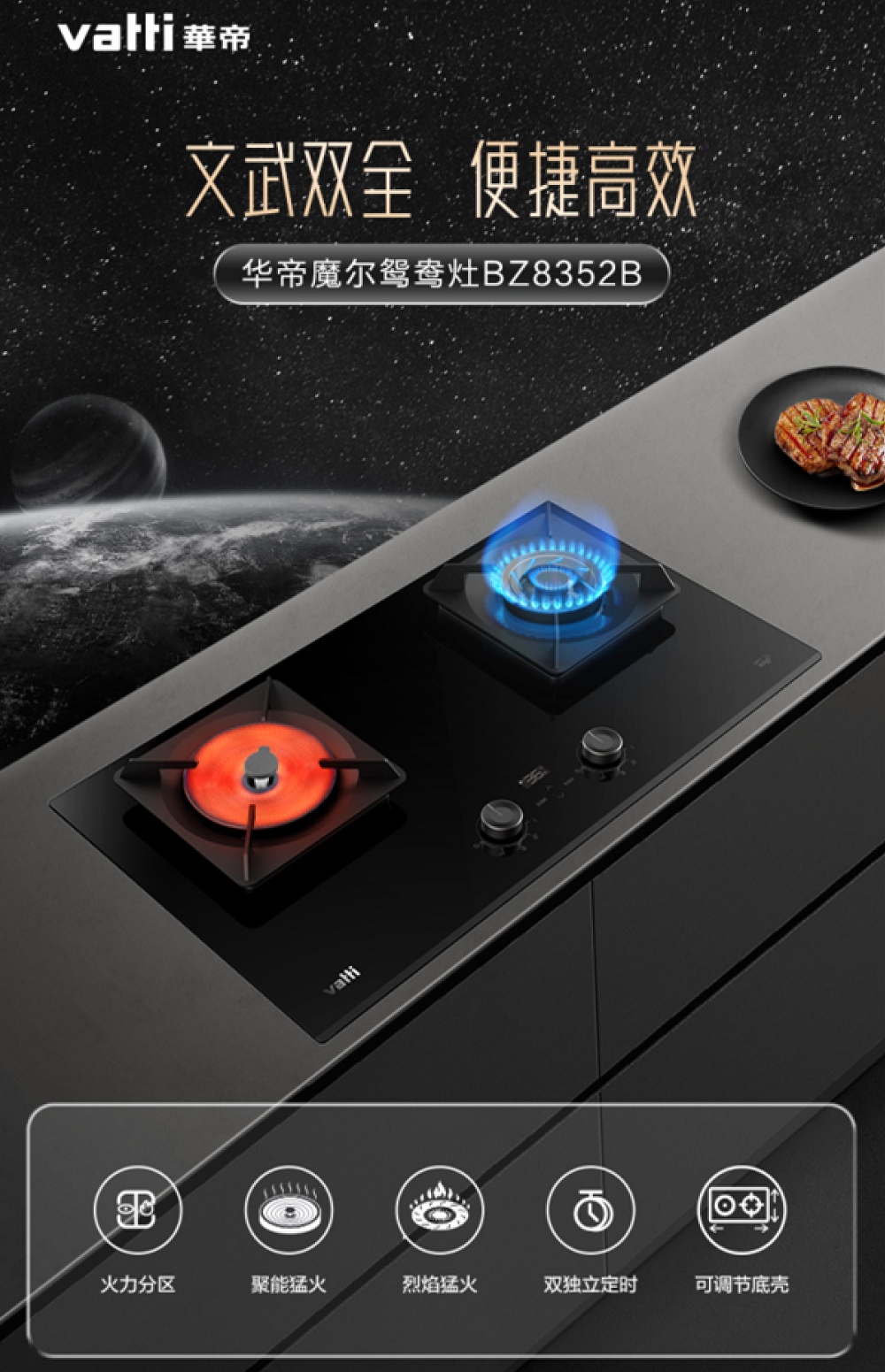 華帝鴛鴦灶BZ8352B,將好用好看好清潔的產(chǎn)品特質(zhì)完美演繹。該產(chǎn)品采用左右分區(qū)設(shè)計,左邊聚能猛火,爆炒鮮香更節(jié)能,右邊烈焰猛火,滿足煎炒蒸燜燉等烹飪要求,實現(xiàn)高效烹飪,滿足全家口味。雙爐頭均可獨立定時,精確把控各式菜品最佳用時,定時提醒,自動切斷氣源,蒸煮、煲湯放心看護。