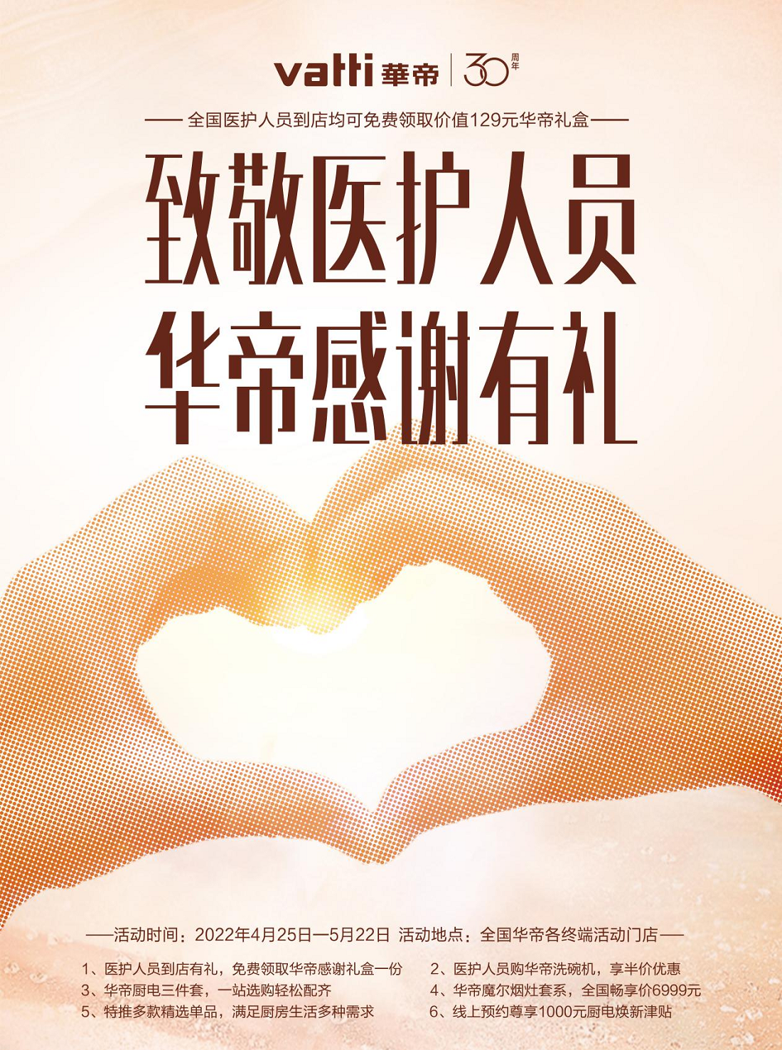 4月25日至5月22日期間,華帝在全國推出“致敬醫護人員 華帝感謝有禮”活動,為所有醫護人員免費派送價值129元的感謝禮盒,醫護人員憑執業證或工作證到全國華帝各終端活動門店即可領取;同時,醫護人員購華帝嵌入式干態洗碗機A2、A5、A6,還可尊享半價優惠。