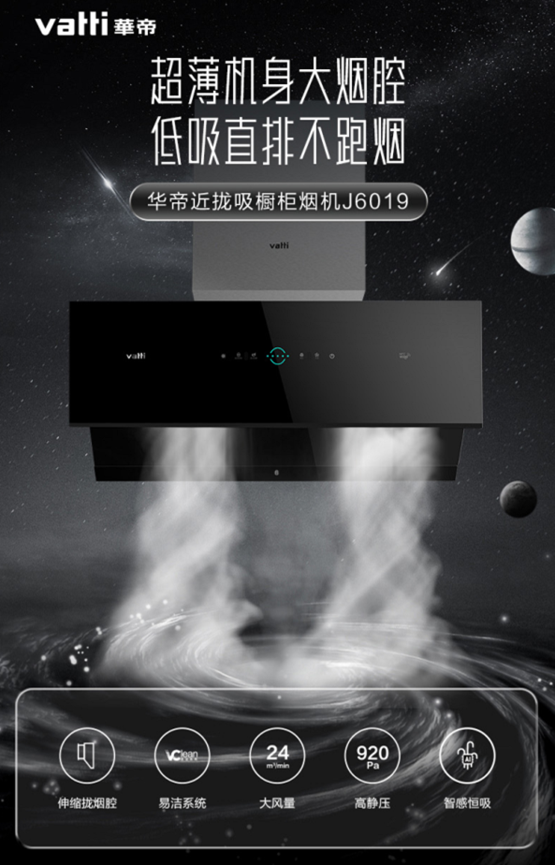 華帝近攏吸櫥柜煙機J6019采用創新攏煙腔外推結構,日常關閉“隱”于櫥柜,釋放廚房空間;超薄機身設計,伸縮攏煙腔,順勢直吸更強勁。另外,J6019還配有手勢智能控制和V-Clean智潔系統,揮手感應,瞬吸油煙,操作更便捷。