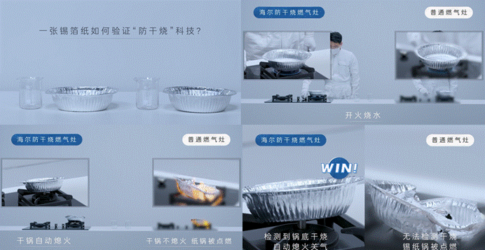 贏在科技:海爾燃氣灶原創“防干燒”科技,實時監測鍋底溫度和火力,開啟熄火保護,因此錫箔紙得以保存完整不被燒壞。