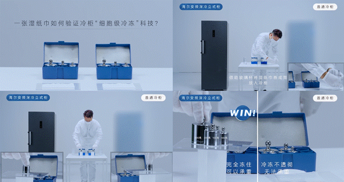 贏在科技:海爾冷柜原創“-40℃細胞級冷凍”科技,低溫急速冷凍鎖鮮,從而使冰凍濕巾承重900g而不倒塌。