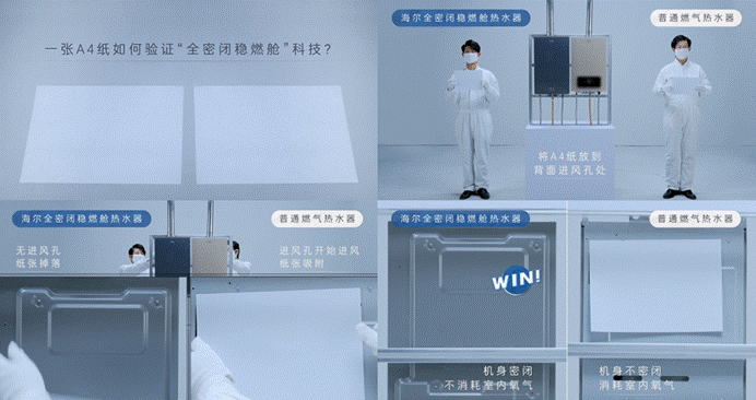 贏在科技:海爾燃氣熱水器原創“全密閉穩燃艙”科技,創新密閉結構設計,機身無進風孔,因此A4紙無法吸附。