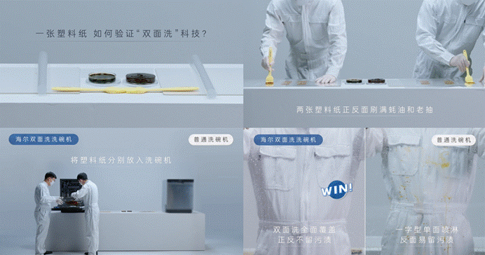 贏在科技:海爾洗碗機原創“雙面洗”科技,實現上下雙向噴淋,從而使塑料紙毫無油污殘留,正反兩面都干凈。