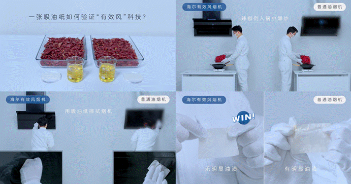 贏在科技:海爾油煙機原創“有效風”科技,自動感知煙霧調節風力大小,從而使吸油紙上沒有明顯油漬。