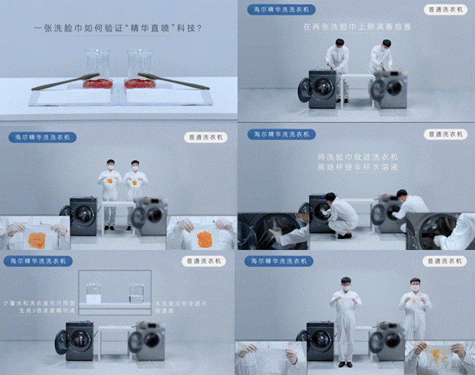 贏在科技:海爾洗衣機原創“精華直噴”科技,3倍濃度的精華液瞬間滲透衣物,從而使面巾紙上的污漬完全洗凈,潔凈如新。