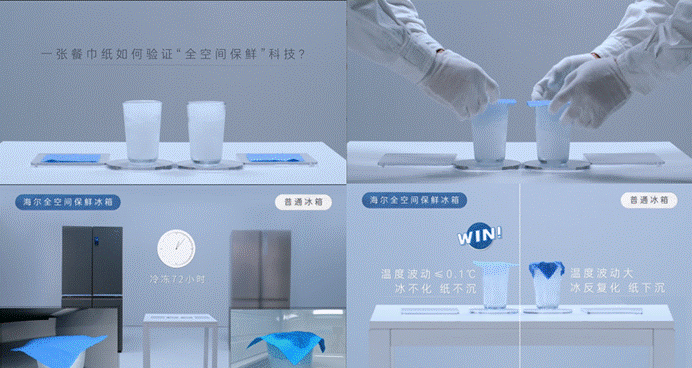 贏在科技:海爾冰箱原創“全空間保鮮”科技,實現溫度0波動、制冷0延遲、風速0干擾,從而使冰不反復融化,餐巾紙不凹陷下沉。