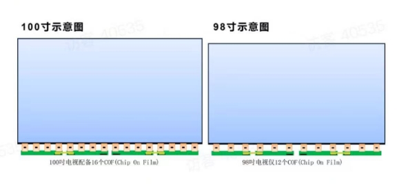 比如畫質(zhì)上,100吋比98吋有著更好的畫質(zhì)表現(xiàn)。原因在于COF這一芯片貼膜技術(shù),100吋可以攜帶16個,而98吋通常帶12個。因為COF數(shù)量多,電視的對比度就更高,顏色表現(xiàn)更好。這使得電視的畫面亮度、對比度和顏色飽和度都有顯著提升,從而提供更優(yōu)質(zhì)的視覺體驗。