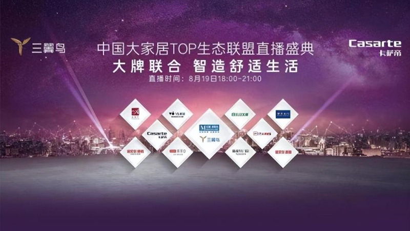 - 8月19日,三翼鳥(niǎo)攜手紅星美凱龍,以及中國(guó)大家居TOP生態(tài)聯(lián)盟中的卡薩帝、諾貝爾、索菲亞等9大頂級(jí)家居品牌,聯(lián)合開(kāi)展“藝墅家裝節(jié)”直播盛典,引發(fā)全網(wǎng)700多萬(wàn)用戶關(guān)注。