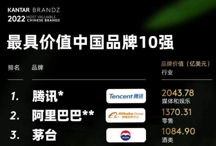 - 8月25日,2022年凱度BrandZ最具價(jià)值中國(guó)品牌100強(qiáng)發(fā)布,騰訊位列百?gòu)?qiáng)榜首,品牌價(jià)值為2043.78億美元;阿里巴巴、茅臺(tái)分別排名第二和第三;海爾則憑借持續(xù)且穩(wěn)定的價(jià)值增長(zhǎng),攀升到中國(guó)百?gòu)?qiáng)的第九名。