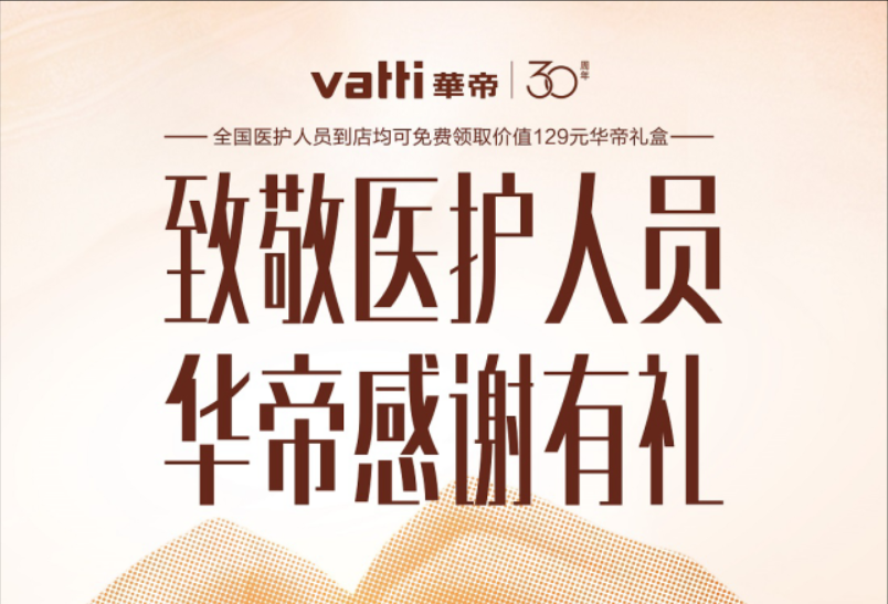 - 4月25日至5月22日,華帝特別推出“致敬醫(yī)護(hù)人員 華帝感謝有禮”全國(guó)活動(dòng),為所有醫(yī)護(hù)人員免費(fèi)派送價(jià)值129元的感謝禮盒,醫(yī)護(hù)人員憑執(zhí)業(yè)證或工作證到全國(guó)華帝各終端活動(dòng)門(mén)店即可領(lǐng)取。