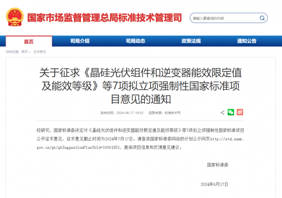 - 近日,國家標準委發布了《關于征求〈晶硅光伏組件和逆變器能效限定值及能效等級〉等7項擬立項強制性國家標準項目意見的通知》,征求意見截止時間為2024年7月17日。其中包含《除濕機能效限