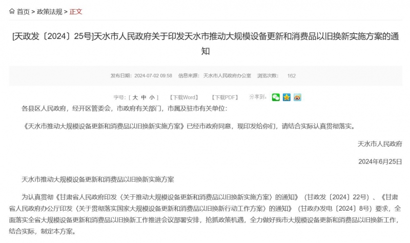 - 天水市人民政府關于印發天水市推動大規模設備更新和消費品以舊換新實施方案的通知