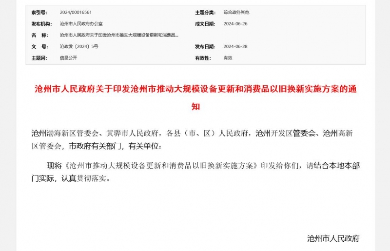 - 滄州市人民政府關于印發滄州市推動大規模設備更新和消費品以舊換新實施方案的通知