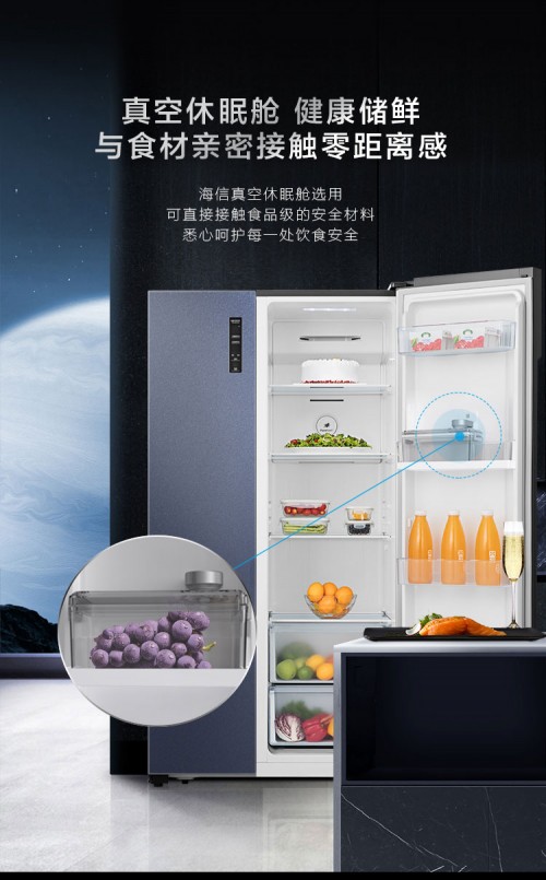 同時海信本代冰箱相比上代冰箱有了更多樣化的儲存保鮮方式,真空休眠艙和真空休眠袋/盒的多種真空保鮮隨意組合設計,打破空間限制,根據需要更改食物真空保鮮方式,為新鮮果蔬、珍品干貨打造更獨立的儲鮮方式,實現儲存空間自由調節。