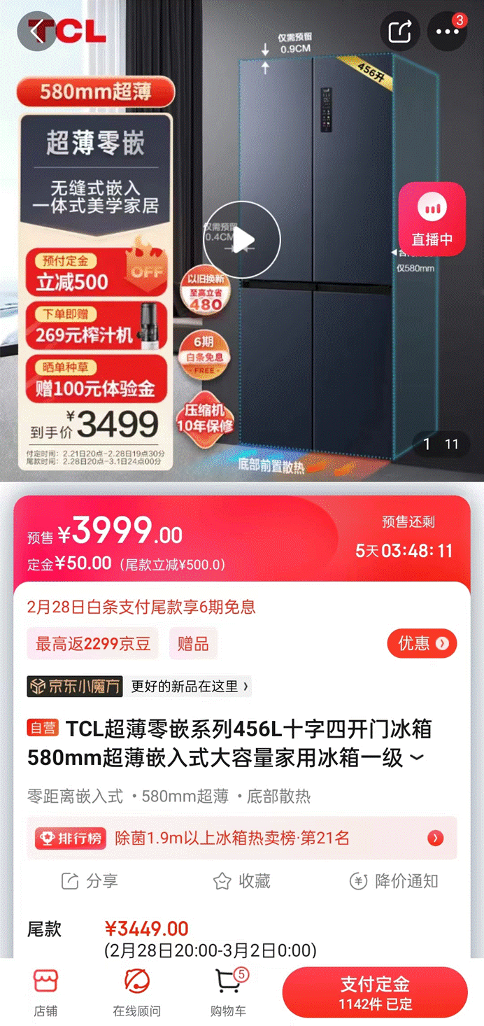 如此,T9由外到內將“一體化美學”做到極致,并從技術層面滿足了用戶追求健康高品質生活的需求。更難能可貴的是,TCL超薄零嵌冰箱R456T9-UQ以同行難以匹敵的高質價比直擊行業腰眼,首發期間僅3499元,首發當天預定量即超過3000臺,某東平臺單店預定量即超過1000臺。