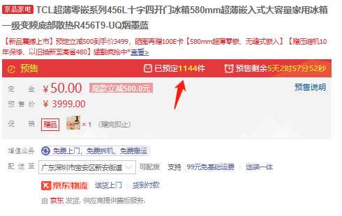 在“一體化”新美居趨勢下,TCL超薄零嵌冰箱以“賞心悅目”的美好體驗為引擎,落腳到“前置思維”的精細化設計過程中,為消費者帶來內外兼修的嵌入式冰箱新體驗。TCL超薄零嵌冰箱R456T9-UQ首發期間價格,做到了非常親民的3499元,首發當天就獲得了超過3000臺的預定,僅僅某東單店預售量即達到破1000+。