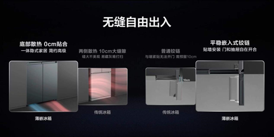 首先是冰箱的核心部件散熱系統。冰箱的散熱系統從最初的背部散熱,發展到目前市面主流的兩側散熱,每一次技術的變革將冰箱的應用場景推向新局面。此次,TCL超薄零嵌冰箱T9為有效解決兩側散熱需預留10-20cm空間的問題,擯棄了成熟的兩側散熱方式,采用了前沿創新的底部散熱設計。