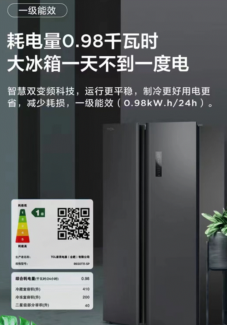 能效標識一般在冰箱的顯眼位置,大部分在右上角。一級能效意味著產品在具體使用過程中更為省電,最后省下來的都是白花花的銀子。同時,買一級能效產品,也是為更好的技術買單,冰箱能達到一級能效,也意味著背后的科技更優秀。
