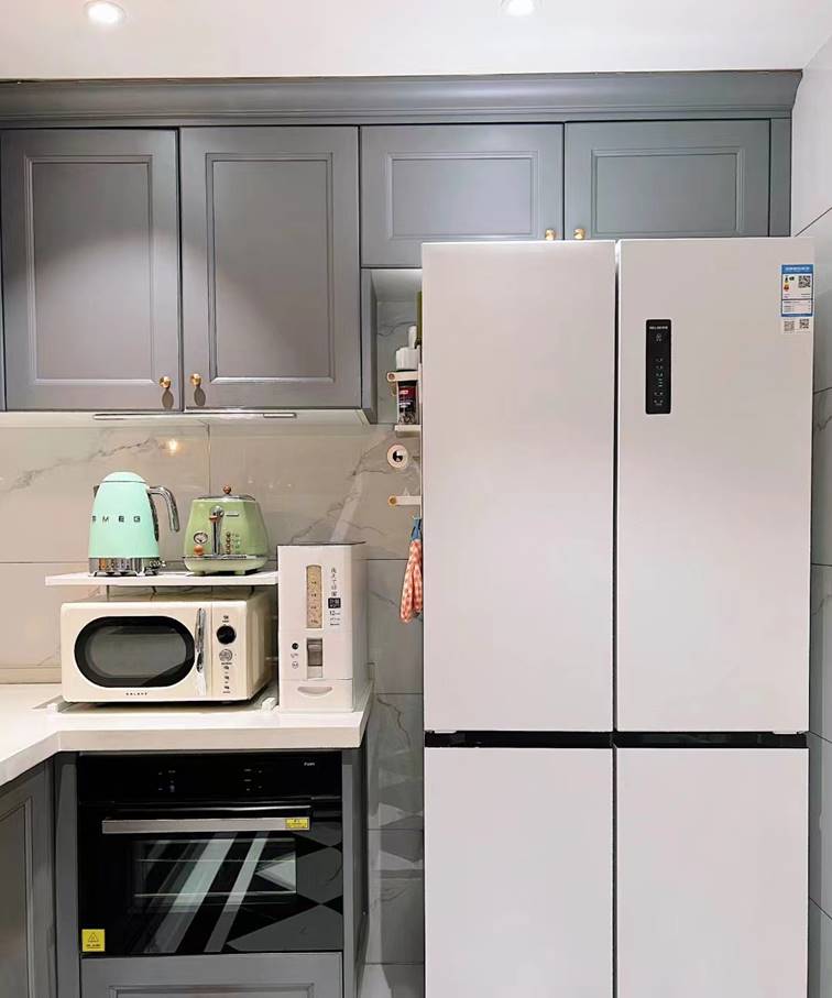 嵌入技術:美的BCD-483WSPZM是兩側5mm平嵌的方式,與4mm相比肉眼看縫隙明顯,機身厚度600mm,和主流600mm櫥柜尺寸相同,但相同的尺寸會造成容錯率低,實際安裝還是會有一點突出櫥柜。