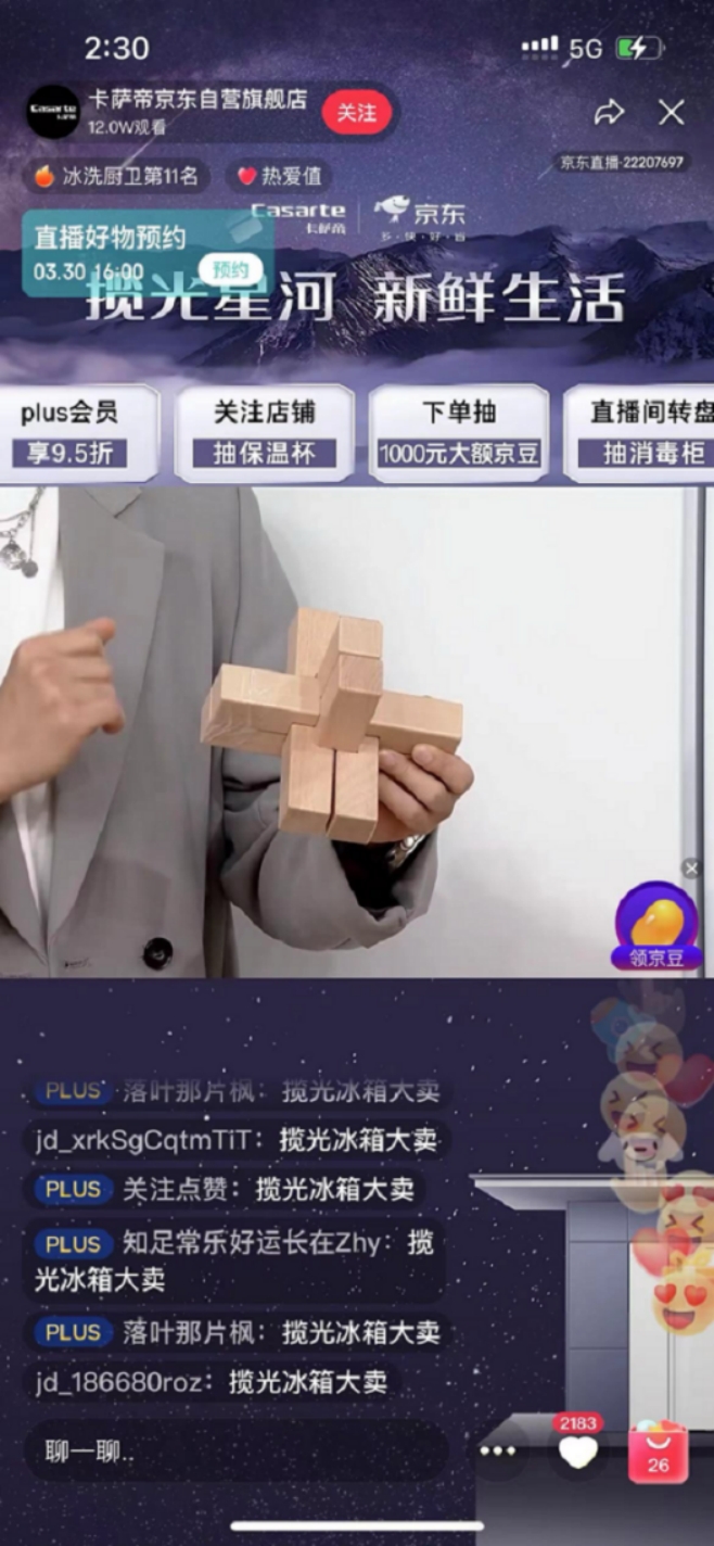 隨后,主持人對(duì)卡薩帝攬光系列零嵌內(nèi)容進(jìn)行詳細(xì)講解,并帶來了一些趣味試驗(yàn)。譬如說,一位主持人挑戰(zhàn)魯班鎖,一位進(jìn)行同步挑戰(zhàn)講解。順利解開后,借助魯班鎖的榫卯鏈接,
