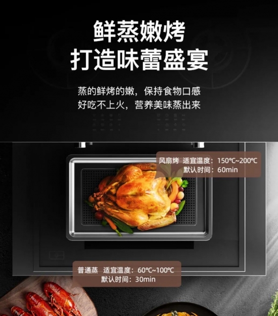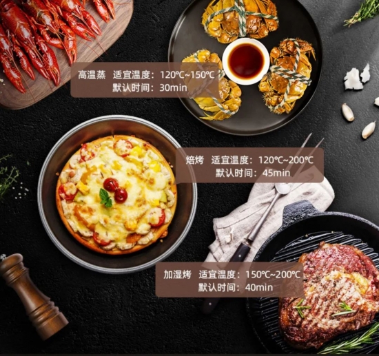 3D立體加熱,食物受熱更均勻,控溫更精準;擁有普通蒸、高溫蒸、風扇烤、加濕烤、燒烤、焙烤等蒸烤模式,能夠滿足不同食物的花樣蒸烤需求。蒸汽動態平衡技術,保持食物本色,鎖住食材營養,可多種食材同蒸不串味。