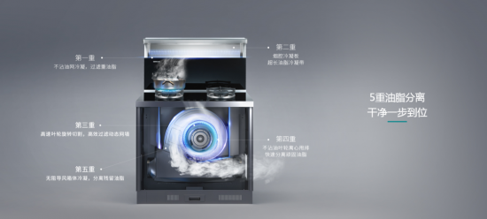 在行業傳統三重油脂分離技術上創新升級為五重油脂分離,油煙分離率高達98%。不僅在油煙吸凈率上大大提高,更易于機器的日常清潔保養和環境保護。