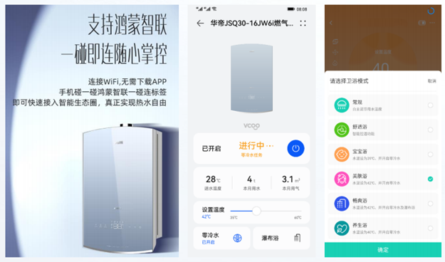 本次發布會上的另一大亮點,則是華帝最新燃熱新品JW6i,該產品選擇HarmonyOS Connect(鴻蒙智聯)系統,能極簡快速配網,其廣泛的平臺布局,可暢想多種場景。在HarmonyOS Connect的加持下,華帝JW6i為用戶提供了極簡交互、極簡連接等全新智慧生活體驗;同時搭載全新半程零冷水加熱預熱技術、變頻增壓瀑布浴技術、專利溫控艙(實用新型專利:ZL201521085968.5)等多項功能,性能方面可謂亮點十足。