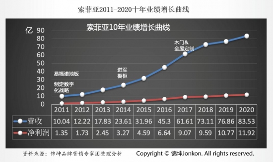 橫向對比同樣是行業的締造者的索菲亞,10年的時間索菲亞找準時機進入櫥柜、木門及全屋定制業務,通過多品類多品牌的運營,獲取盈利增長點,實現10年從10億到80多億的業績增長,目前正在穩步沖刺百億。