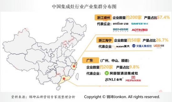 截止至2020年,中國集成灶企業將近400家,且在全國形成了三個產業集群,主要分布在浙江嵊州、浙江海寧、廣東的廣州、中山和順德三大區域。