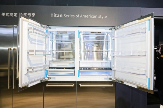 Titan系列的定位為頂奢美式高定廚電套系,包含包括冰箱、煙機、站烤在內的多個品類的廚房電器,整體風格為典型的美式風,主打高端定制化,打造頂奢美式大宅。該系列現有產品包含91CM和76CM超寬的兩種規格美式嵌冰,北美箱式煙機、T型煙機和120CM規格的美式站烤。其中,以76cm寬度、2123cm高度,以及500L的超大容量冰箱,讓TA成為了粗獷不羈的奢華美式風格代名詞。