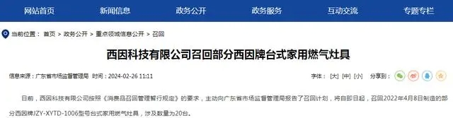 - 日前,西因科技有限公司按照《消費品召回管理暫行規(guī)定》的要求,主動向廣東省市場監(jiān)督管理局報告了召回計劃,將自即日起,召回2022年4月8日制造的部分西因牌JZY-XYTD-1006型號臺式家用燃氣灶具