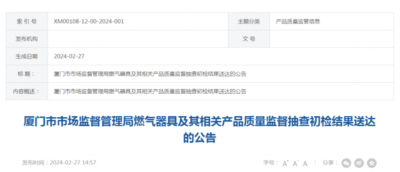 - 廈門市市場監(jiān)督管理局燃氣器具及其相關產(chǎn)品質(zhì)量監(jiān)督抽查初檢結果送達的公告