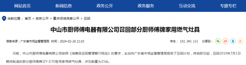 - 日前,中山市廚師傅電器有限公司按照《消費品召回管理暫行規(guī)定》的要求,主動向廣東省市場監(jiān)督管理局報告了召回計劃,將自即日起,召回2019年7月1日期間制造的部分廚師傅牌JZY-D70型號家用燃氣